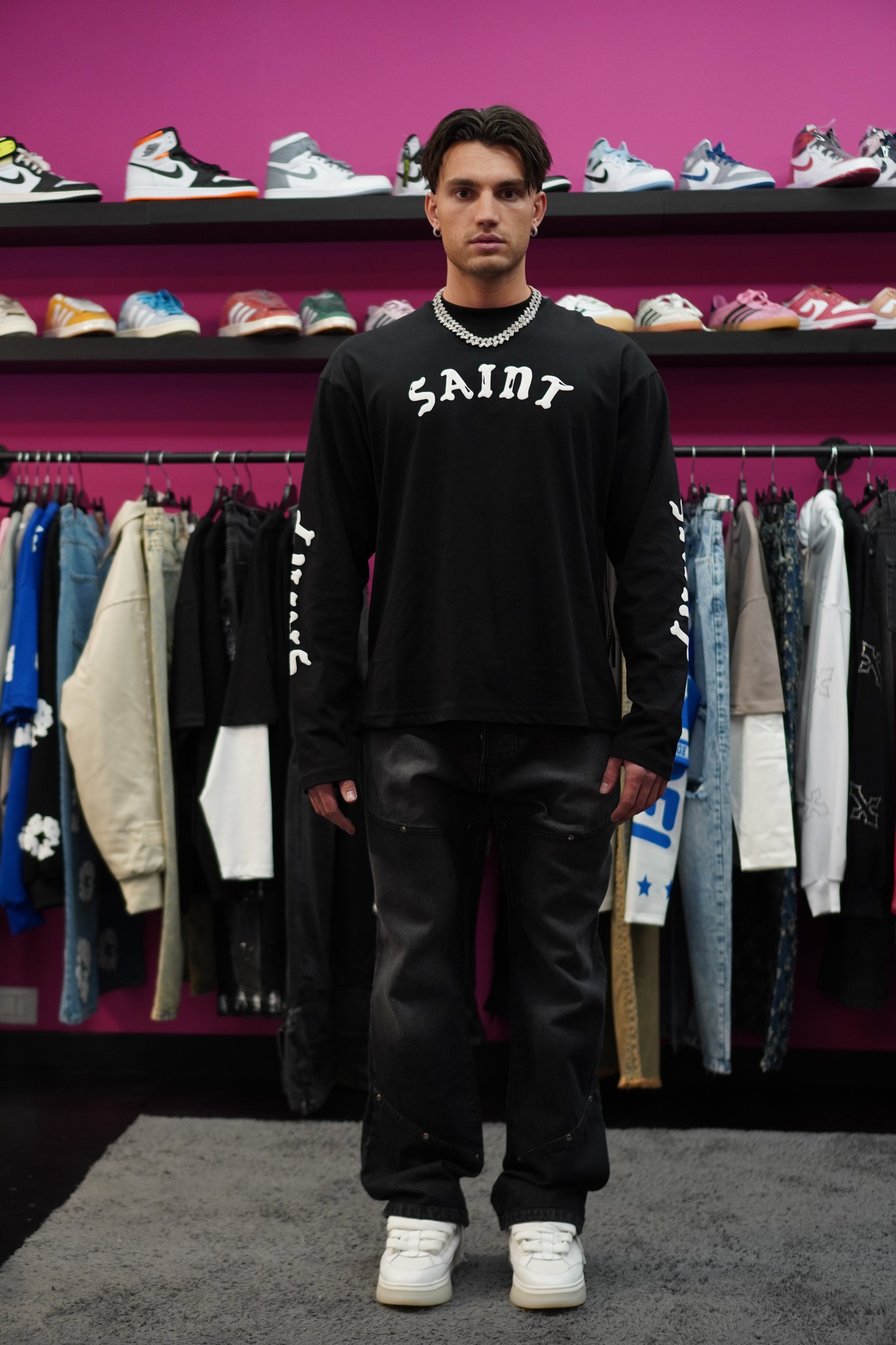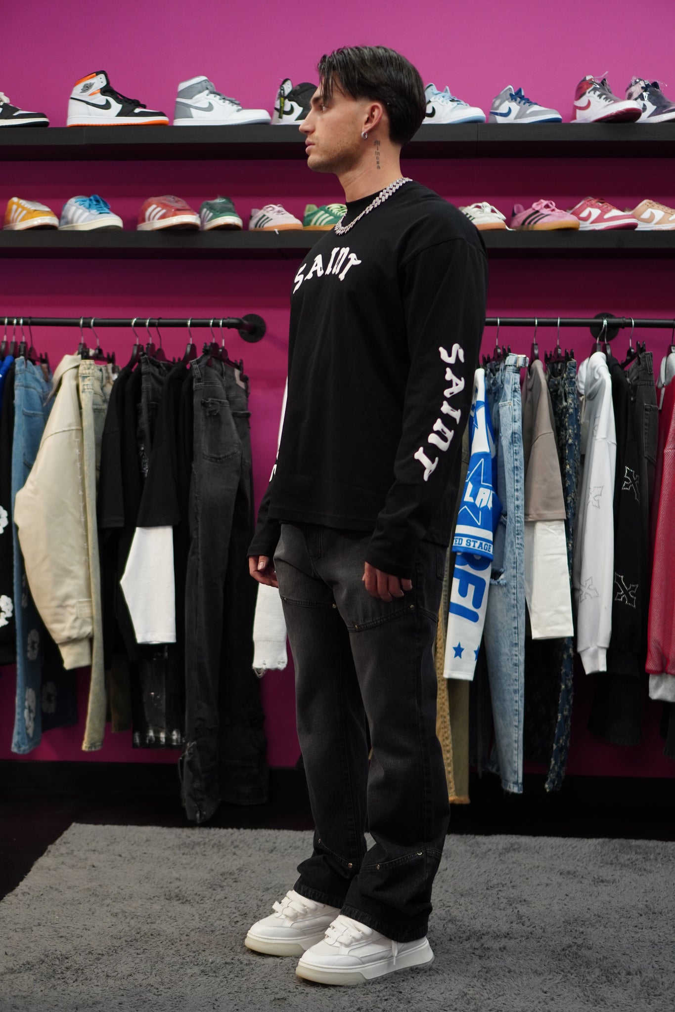 Il modello e’ alto 1.80 e indossa una 48
